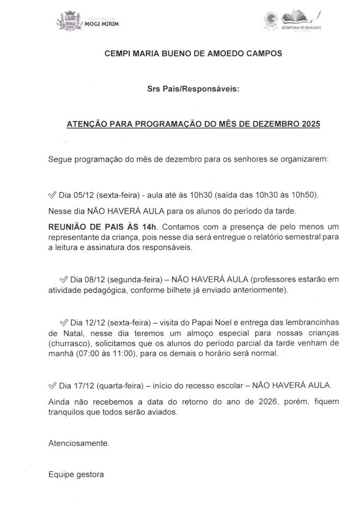 No dia 12 de dezembro, está sendo organizado pela coordenadora do Maria Bueno, segundo o recado (em anexo) enviado aos pais dos alunos, um almoço especial com entrega de lembranças.